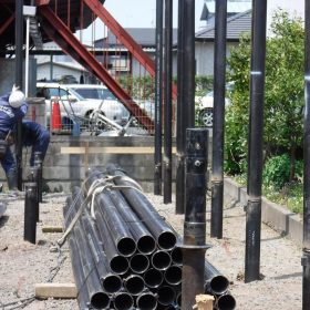 【天井高2.7m ハンモックのある家】 地盤調査~杭打ち 【天井高2.7m ハンモックのある家】 本格的な工事の前に先ず地盤の調査を行います。 こんな機械を持ってきて、先端のドリルに棒を継ぎ足しながら地面の中に打ち込んで、固い岩盤までの地盤の状態を調 …